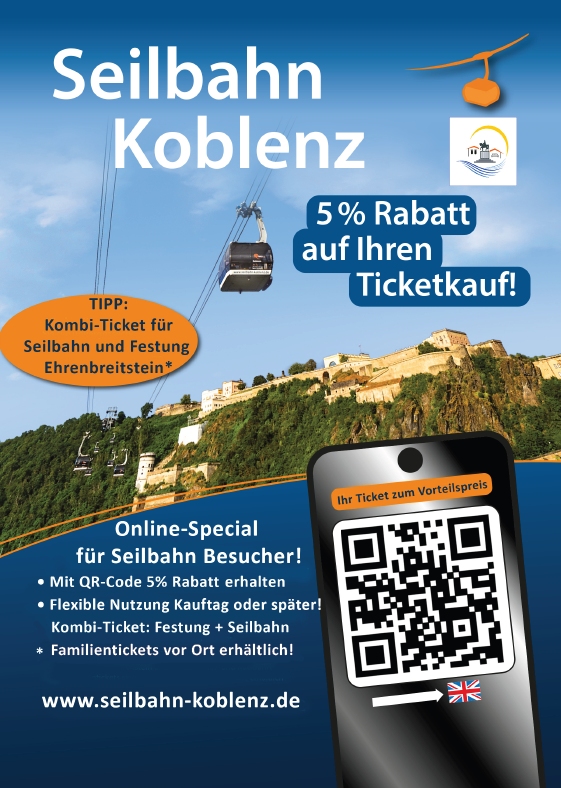 Bei uns sind Sie richtig! Denn neben unseren schönen Wohnungen bieten wir Ihnen auch einen Rabatt auf die Fahrt mit der Seilbahn vom Deutschen Eck über den Rhein bis hoch zur Festung Ehrenbreitstein.